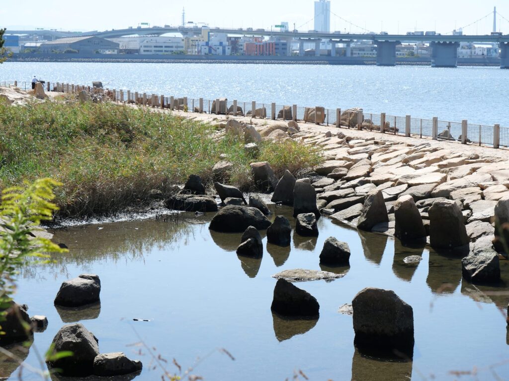 矢倉緑地の最大の魅力の一つは、人工護岸では見られない、自然の地形を活かした「潮だまり(タイドプール)」や「干潟」が広がっていることです。