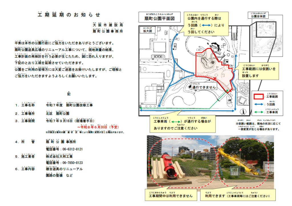 扇町公園遊具広場リニューアル工事につきまして、次のとおり工期を延期させていただきます。